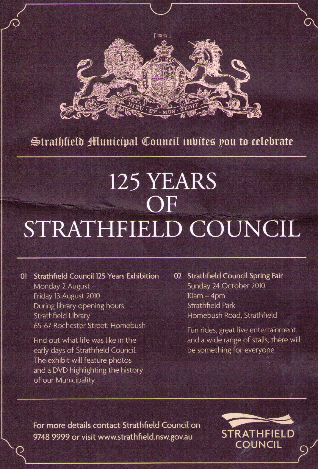 An exhibition of 125 years of Strathfield Council will be held from Monday 2nd August to Friday 13 August 2010 at Strathfield Library, 65-67 Rochester Street Homebush during Library opening hours.