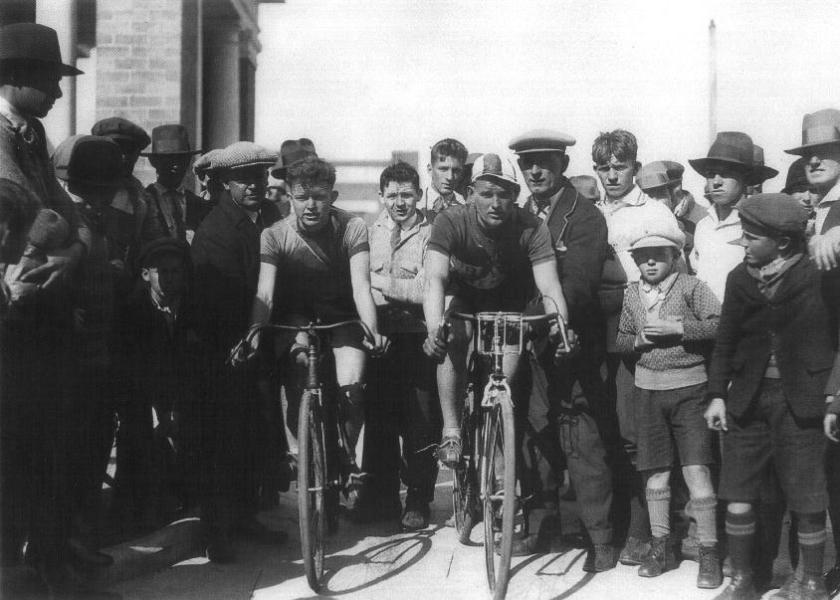 The above photograph was taken in September 1930 and features George Hird (shown with no cap), a rider from Hurlstone Park and the winner of the Goulburn to Sydney Bicycle Race. George is with his father Richard Hird. His competitor was L. Petrie [on the right] surrounded with onlookers at the race finish at Enfield Town Hall, Liverpool Road, Enfield.