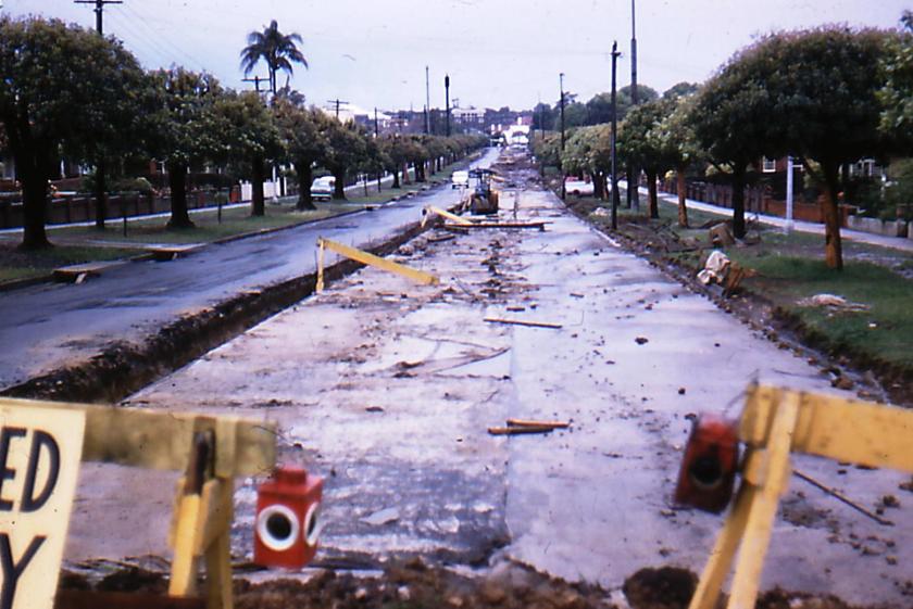 This photo shows road and kerb construction of Redmyre Road in 1959. The photo is facing towards the Strathfield Town Centre and would have been taken near the intersection of Homebush and Redmyre Roads. Redmyre Road is a heritage conservation area and most of the buildings have not altered since this time. The Brush Box (Lophostemon confertus ) street trees are well established and remain a significant feature of the streetscape of Redmyre Road.