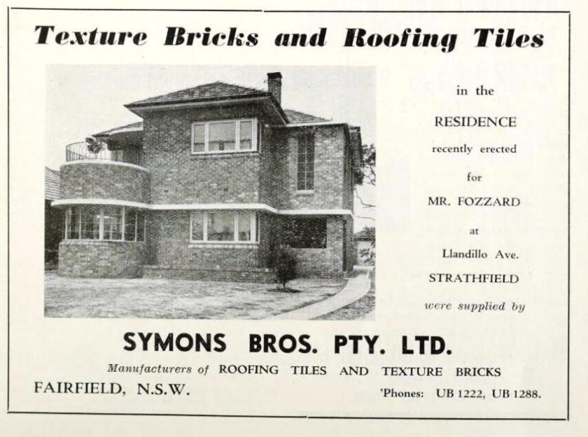 This advertisement from Building Magazine (Vol. 67 no. 399 November 24 1940) features an image of 52 Llandilo Avenue Strathfield, a two storey brick interwar Functionalist style house. This house was built on Lot B, land subdivided from ‘Dunrobbin’ at 54 Llandilo Avenue. 52 Llandilo Avenue was the home of Allan Manning Fozzard and his wife Dorothy Clara Fozzard from 1938 to 1970, when it was sold for $55,000. This brick house of nine rooms was approved for building in August 1938 at an estimated building cost of £2000.