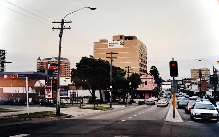 A photo from 1995 on The Boulevarde Strathfield facing the shops at the Strathfield Town Centre. The Ampol Petrol Station is long gone but many landmarks are still in place.