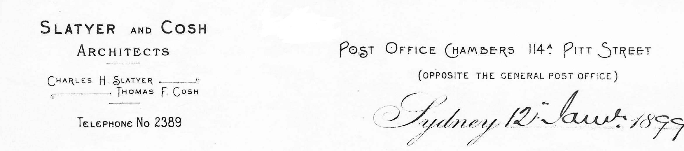 | 1898 | Slatyer & Cosh designed extensive additions to ‘Glen Luna’ Carrington Avenue for Dr Sly. |