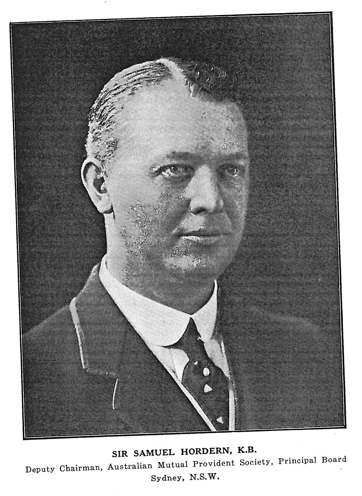 Samuel Hordern (known as Samuel Hordern Junior until the death of his father Samuel Hordern in 1909) was the eldest son of Samuel Hordern, the grandson of Anthony Hordern of the Anthony Hordern & Sons retail empire and the chief controller of the Anthony Hordern & Sons business between the death of his father in 1909 and the sale of the retail business in 1926 to public investors. Anthony Hordern & Sons was one of Sydney’s great retailers known as the “universal provider’, which at one stage employed over 4000 staff.