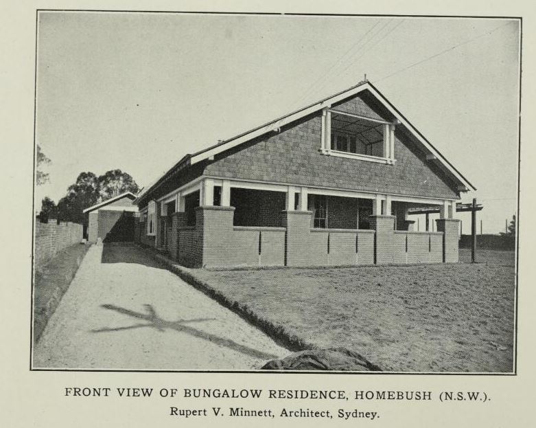 Billesdon’ 104 Burlington Road Homebush was built in 1915. This house was featured in Building Magazine in 1915 and identified the architect as Rupert V Minnett. The house was again featured Building Magazine in February 1919 with commentary concerning the unusual design of the house ‘this is severe in its simplicity, and not an elevation in which the Australian usually delights. There are owners who prefer comfort to external effects’.