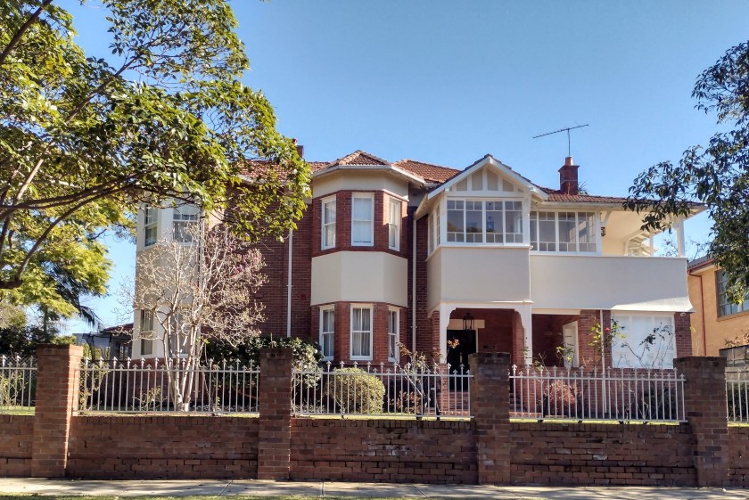 ‘Winkurra’ is a substantial two storey face brick Federation era house located on the corner of Florence Street and Elwin Street Strathfield. The house shows Federation Arts and Crafts style influences with complex hipped and gabled unglazed terracotta tiled roof.