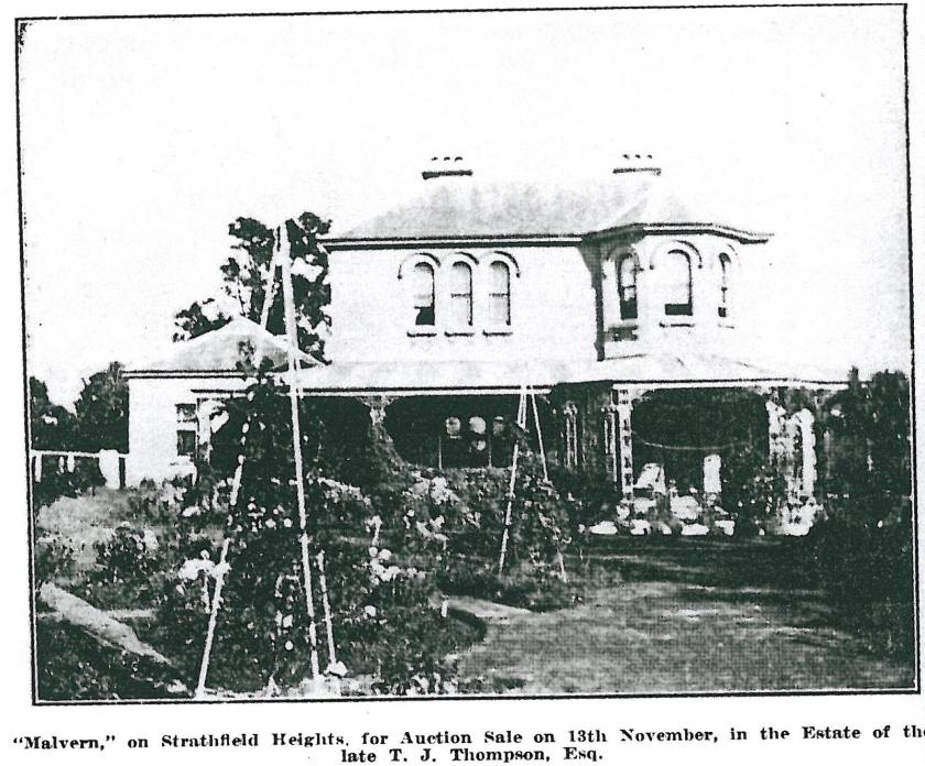 ‘Malvern’ was located on The Boulevarde Strathfield and was bounded at the north by Albyn Road and at the west by Kingsland Rd. It was built c.1870 and was demolished c.1919. At its southern boundary, it bordered ‘Llandilo’ the estate of Sir Philip Sydney Jones, brother-in-law of ‘Malvern’s’ owner Thomas J Thompson.