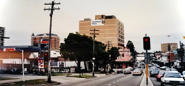 A photo from 1995 on The Boulevarde Strathfield facing the shops at the Strathfield Town Centre. The Ampol Petrol Station is long gone but many